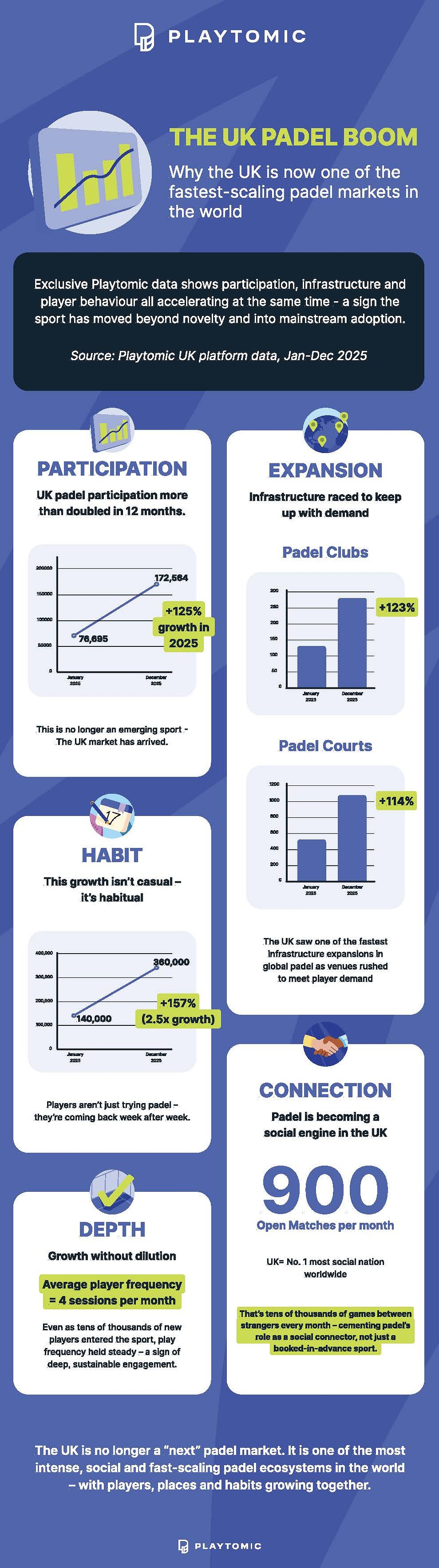 * Playtomic currently supports an estimated 80% of UK padel clubs through its booking and community platform, providing one of the most comprehensive views of participation trends in the country.